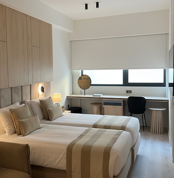 Το συγκεκριμένο ξενοδοχειακό έργο αφορούσε τη σκίαση 130 δωματίων, με βασικό ζητούμενο τον απόλυτο έλεγχο του φωτισμού και τη συνολική εμπειρία άνεσης του επισκέπτη. Η λύση έπρεπε να ανταποκρίνεται στις απαιτήσεις ενός σύγχρονου χώρου φιλοξενίας, συνδυάζοντας διακριτική αισθητική, λειτουργικότητα και σταθερή απόδοση στην καθημερινή χρήση. Η επιλογή ηλεκτροκίνητων ρόλλερ blackout με ενσύρματη λειτουργία αποτέλεσε τον πυρήνα της μελέτης, ώστε κάθε δωμάτιο να προσφέρει πλήρη συσκότιση, εύκολη χρήση και ενιαίο αποτέλεσμα σε όλη την ξενοδοχειακή μονάδα.