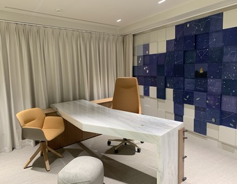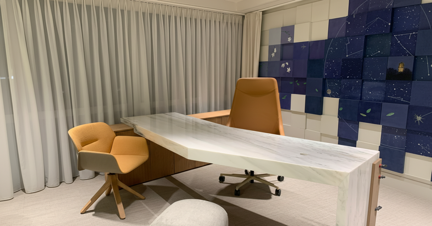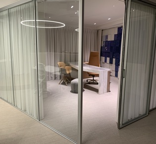Εγκαταστάθηκαν συστήματα διπλής σκίασης, με ηλεκτροκίνητους σιδηροδρόμους για τις blackout κουρτίνες και χειροκίνητους για τις λεπτές. Στο Meeting Room, η χρήση ασύρματων (wireless) μοτέρ εξασφάλισε πλήρη αυτοματισμό χωρίς καλωδιώσεις. Το premium αποτέλεσμα ολοκληρώθηκε με ειδική χειροποίητη ραφή σε όλα τα υφάσματα, συνδυάζοντας την τεχνολογία με την υψηλή ποιότητα κατασκευής.